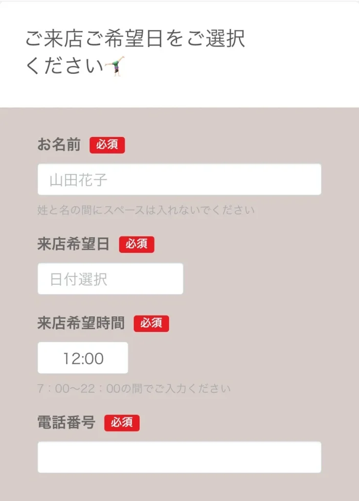 店舗を選んだあとは、名前・希望日・時間・電話番号を入力するだけで申し込み完了。