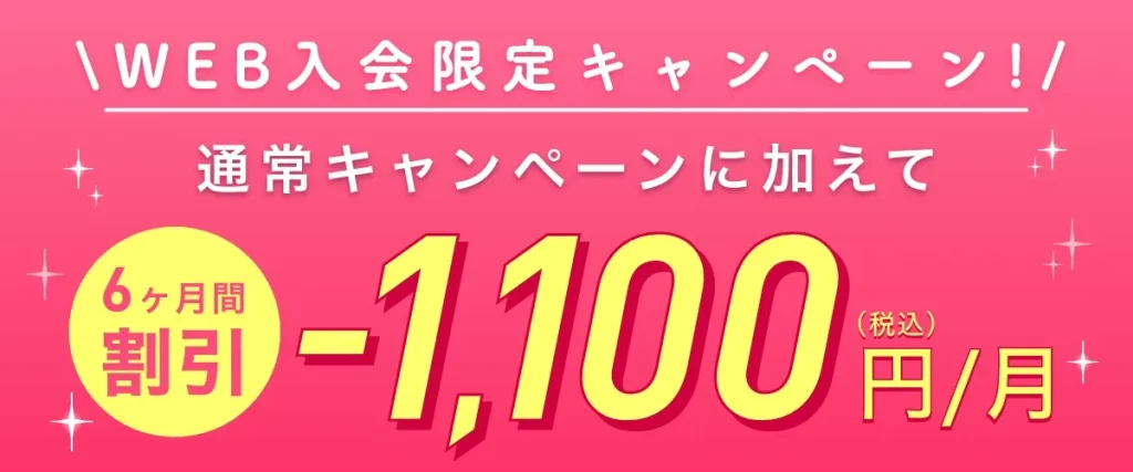 通常の入会キャンペーン終了後から、6ヵ月間 月額会費が1,100円(税込)引きになります。