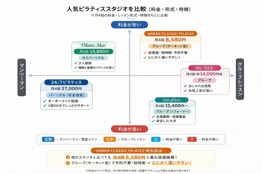 こうして比較すると、urban classic pilates 明大前は他のピラティススタジオと比べてもかなり通いやすい価格帯であることがわかります。